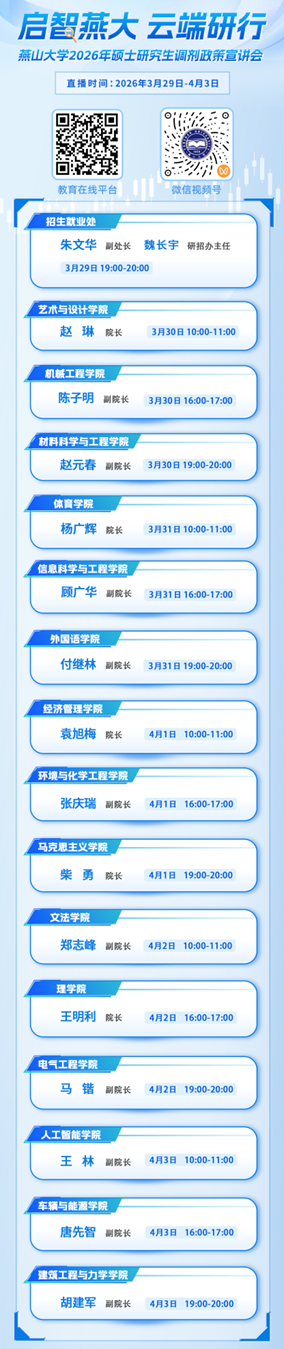 全国硕士研究生调剂工作即将开始,为方便广大考生深入了解燕山大学学科建设与研究生教育培养特色,满足研招政策咨询需求,进一步畅通学校与考生间的信息沟通渠道,燕山大学将于3月29日至4月3日进行2026年硕士研究生调剂政策直播宣讲会活动。各学院院长和学科负责人在直播间与广大考生进行面对面交流,具体日程安排如下: