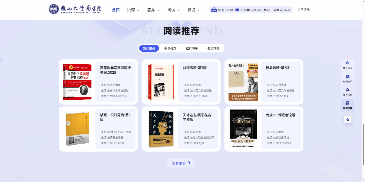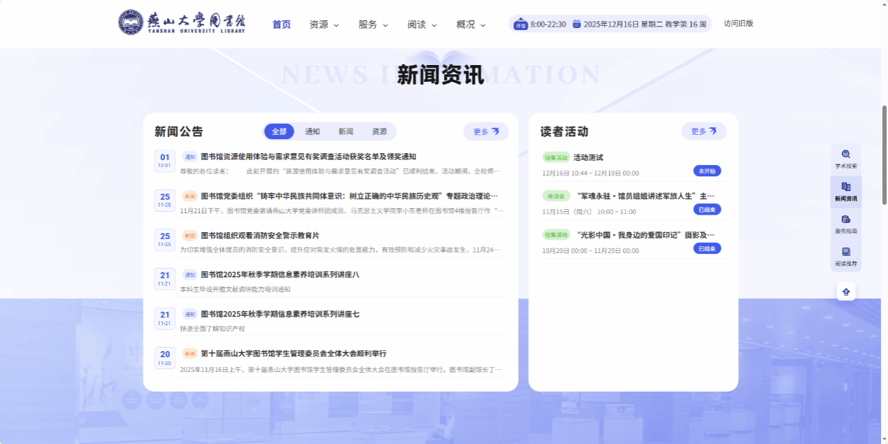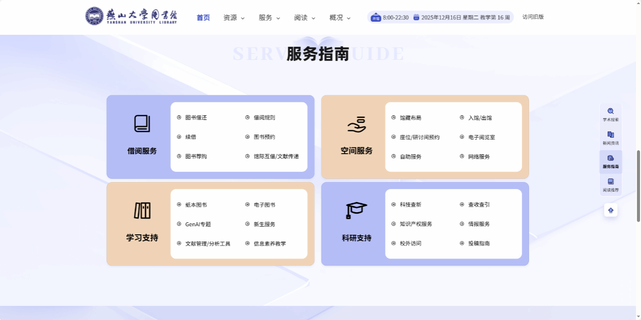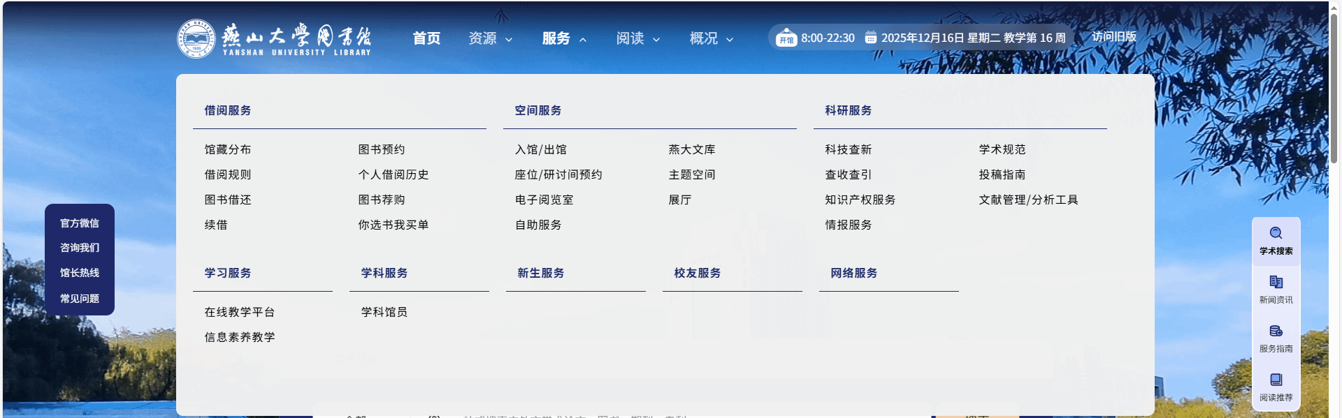网站顶部导航菜单依据读者使用习惯与核心需求,重构与优化为“资源”、“服务”、“阅读”、“概况”四大模块,直观、全面、清晰地呈现图书馆各类文献资源、空间服务及信息支持内容。