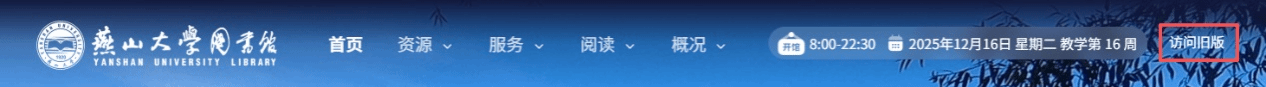 注:若您对新版门户网站的界面或操作尚不习惯,可通过首页右上角图示位置“访问旧版”切换回原图书馆网站。