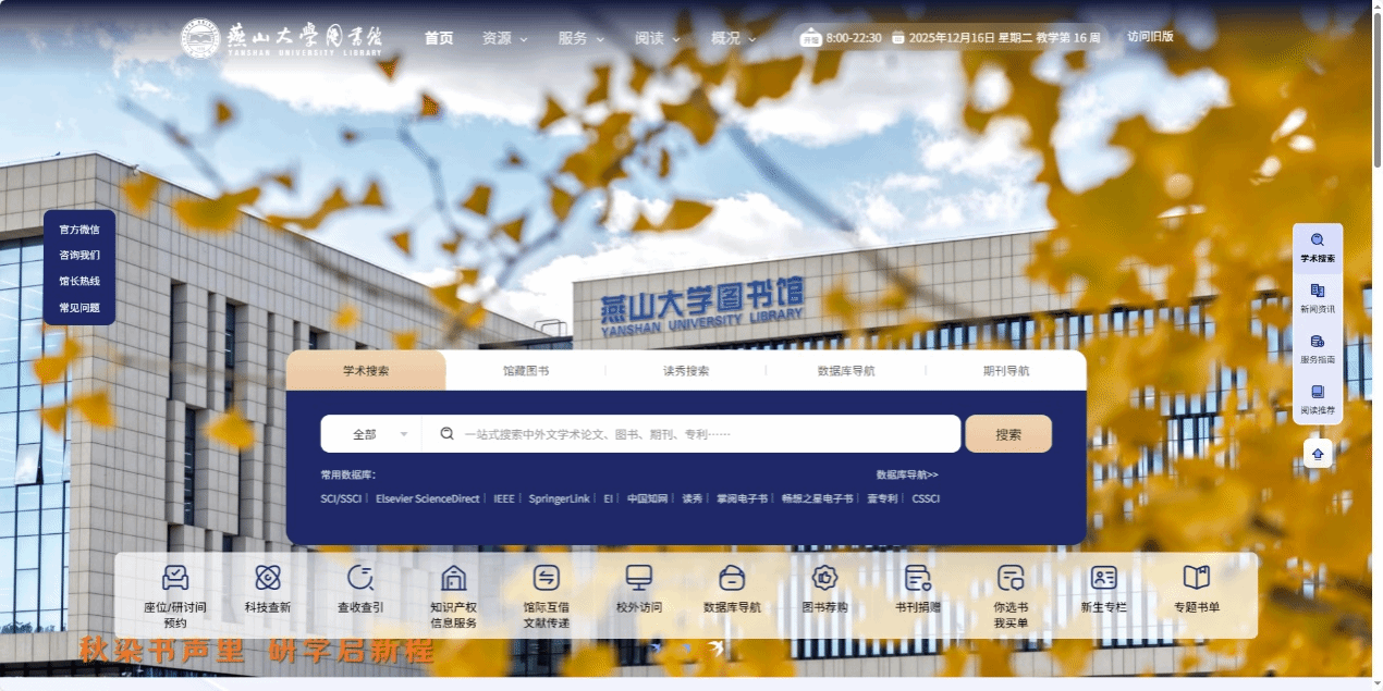 为更好地服务广大师生,满足学术研究、人才培养和学科建设的需求,图书馆全新改版的门户网站正式上线运行。新版网站以优化用户体验为核心,对界面布局、功能模块及资源整合等进行了全面升级。主要方面涉及如下: